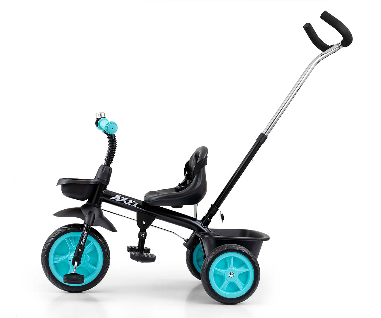 Az AXEL háromkerekű kerékpárt a babák kényelmét és biztonságát, valamint a szülők kényelmét szem előtt tartva tervezték. Tökéletes megoldás az aktív babák számára, akik unatkoznak a babakocsiban való utazás során.