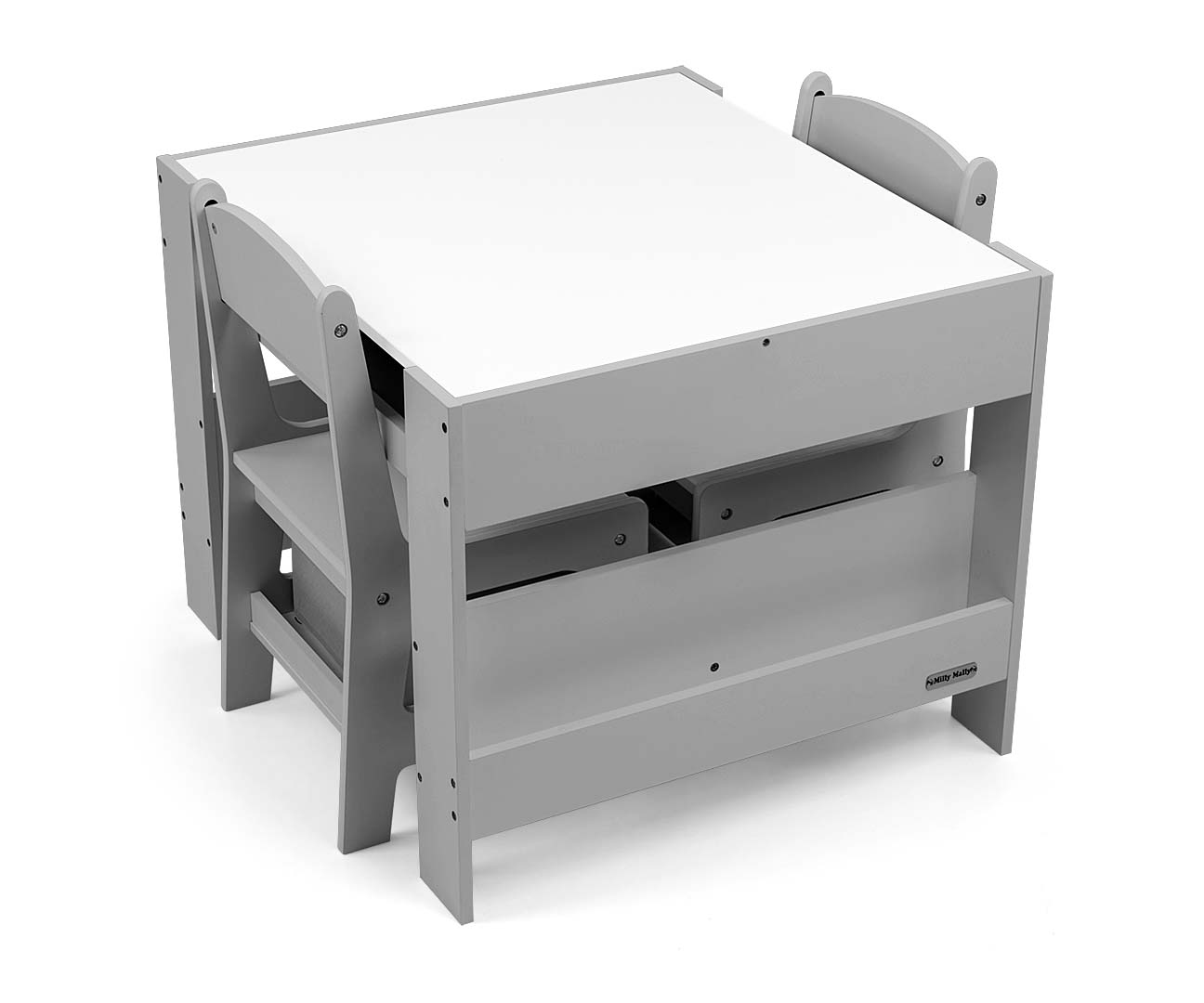 Az asztal mindkét oldalán profilozott nyílások biztosítják a gyermekek számára a tárolóhelyhez való hozzáférést