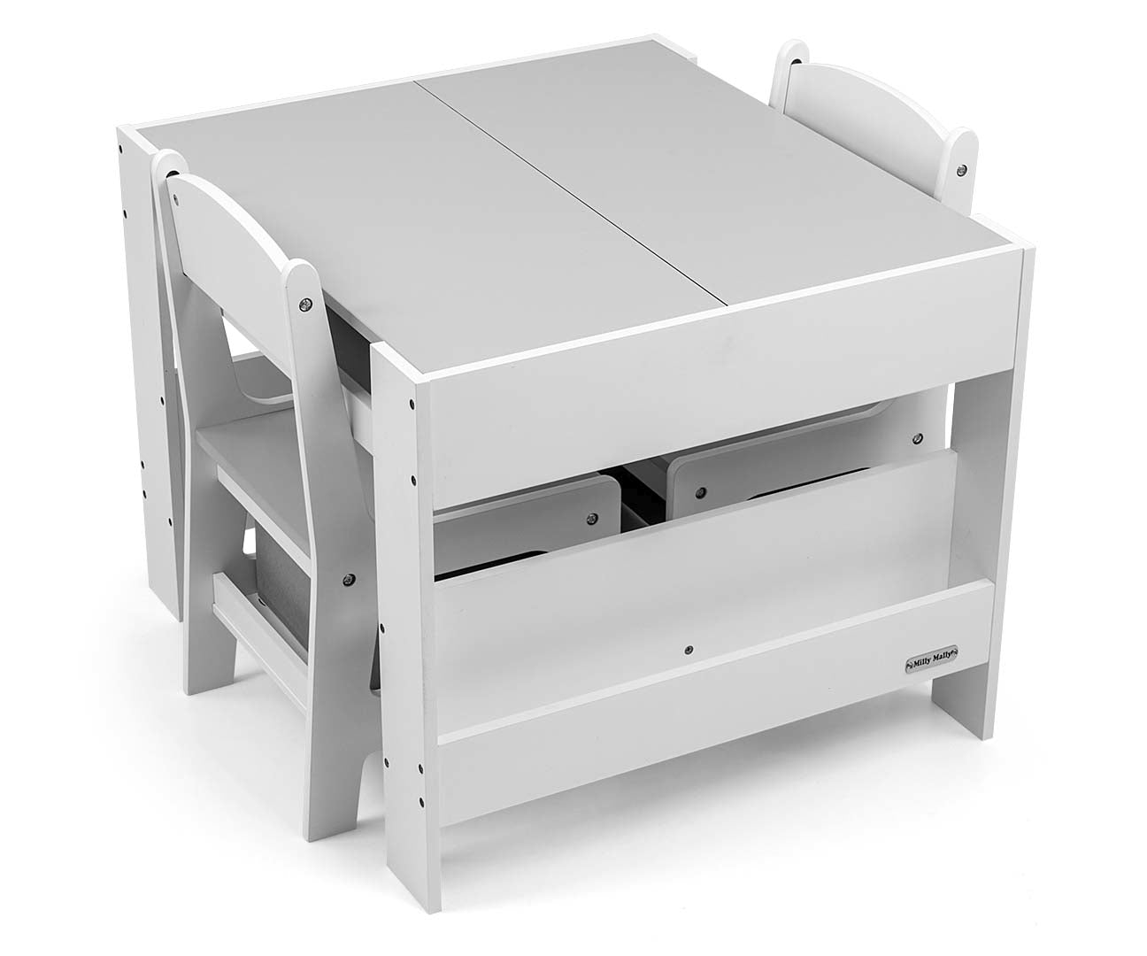 Az asztal mindkét oldalán található profilos nyílások lehetővé teszik a gyerekek számára a tárolóhely elérését