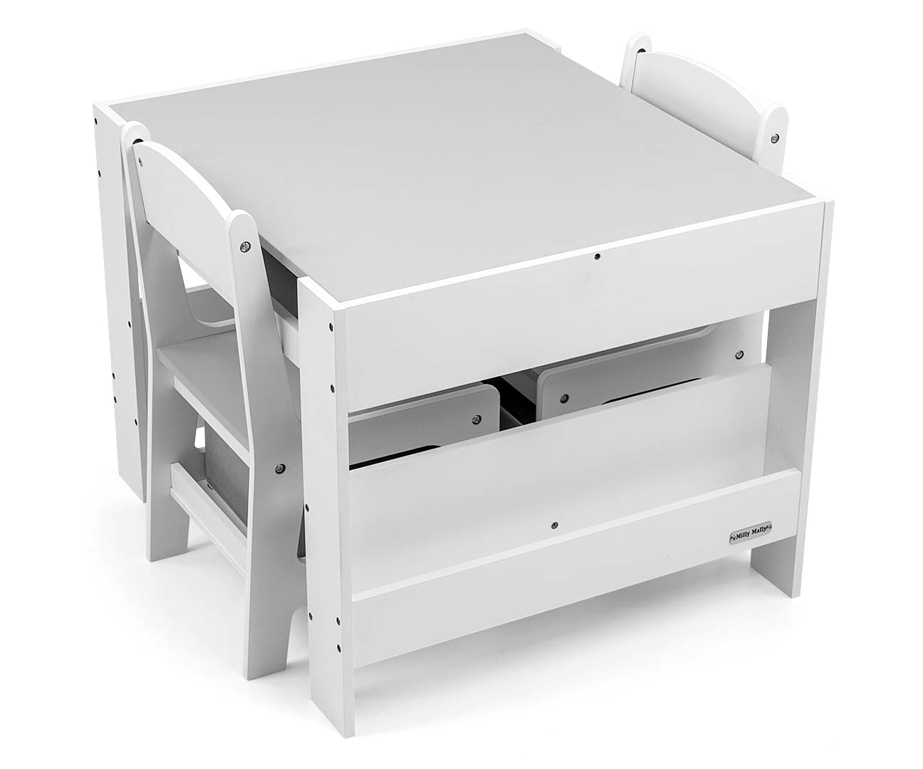 Az asztal mindkét oldalán profilozott nyílások biztosítják a gyermekek számára a tárolóhelyhez való hozzáférést