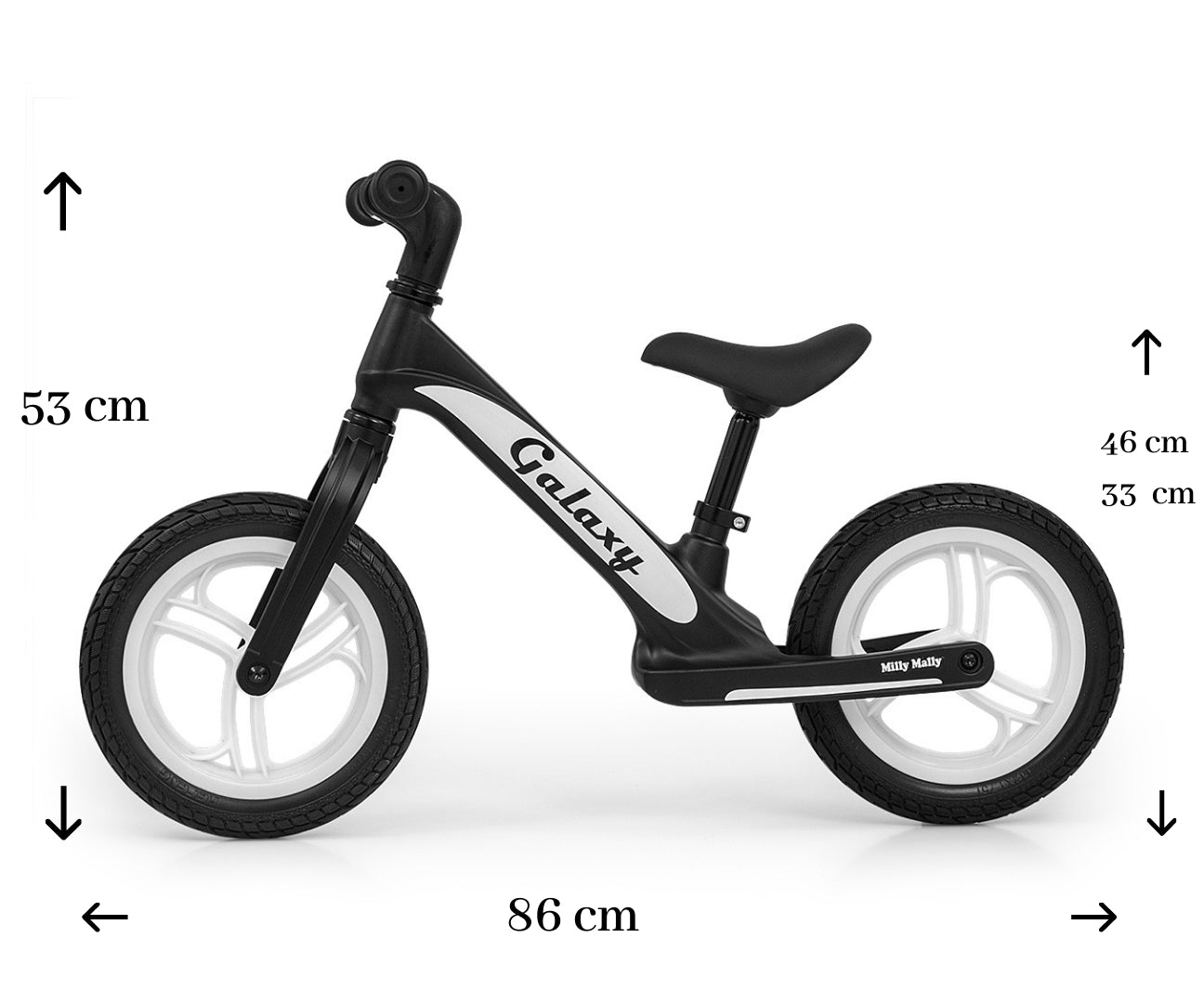 Tartós és a legújabb EVA hab technológiával készült, áthatolhatatlan 12 hüvelykes kerekek, amelyeket nem kell pumpálni, karbantartásmentessé teszik őket. Az ergonomikus, puha töltettel ellátott nyereg és a magasságállítás lehetősége lehetővé teszi, hogy a kerékpár a gyermekkel együtt nőjön. A Galaxy golyóscsapágyas torziós kormánykerékkel rendelkezik. A csúszásmentes, puha gumi fogantyúk biztosítják a biztonságos fogást és a kényelmes irányítást. Ez a futóbicikli hegesztésmentes technológiával készült.