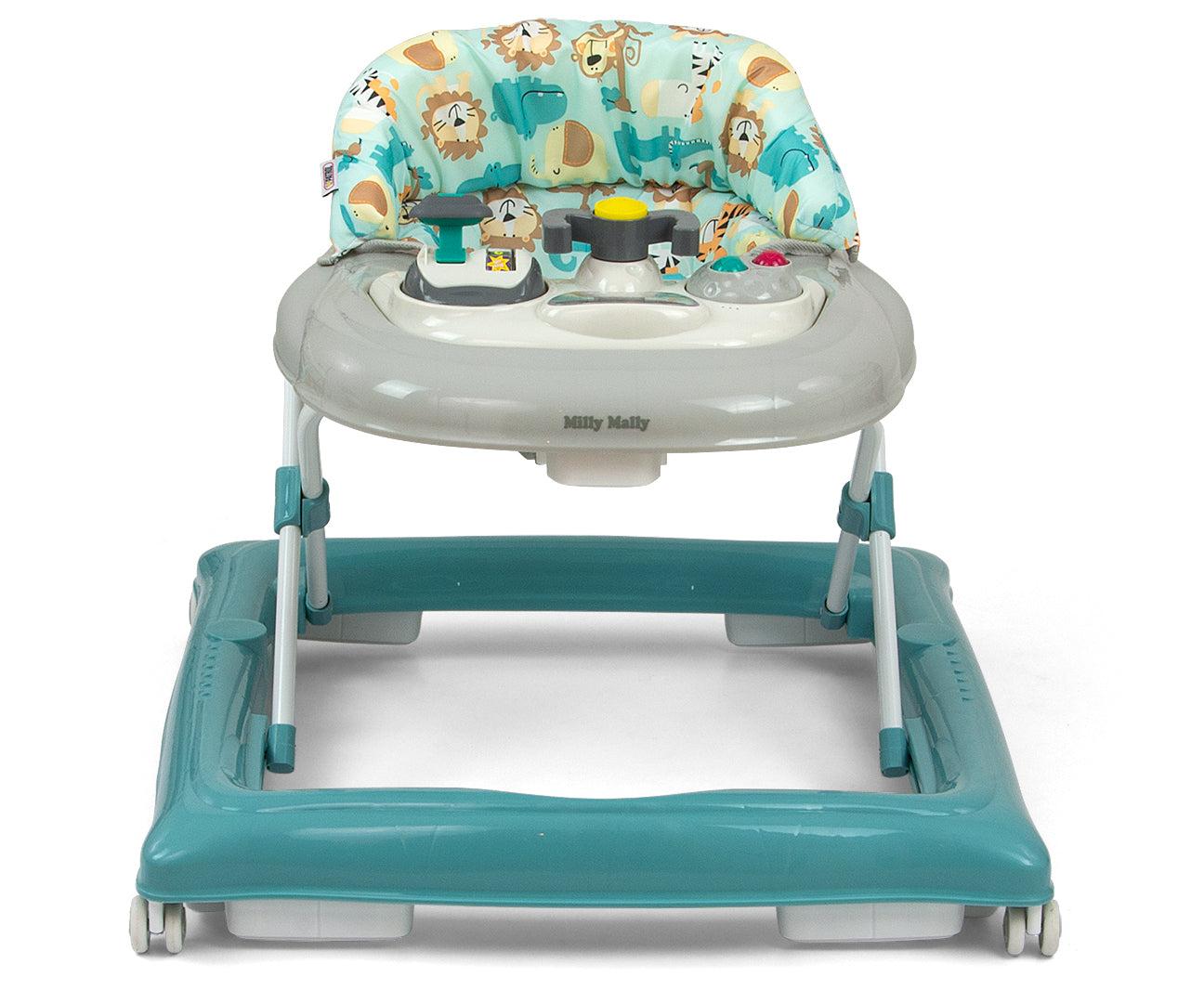 A járókeret négy, nagyon jó minőségű forgókerékkel rendelkezik, amelyek nem karcolják a padlót. A járókeret nyolc gumiütközővel is rendelkezik, amelyek megvédik a gyermeket az eséstől.