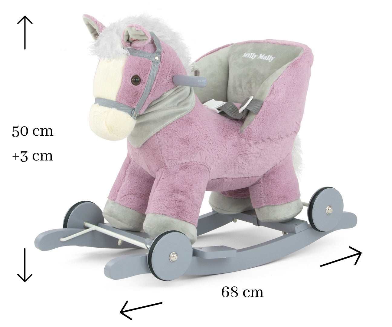 A játék fa fogantyúkkal és lábtartós hintákkal van felszerelve, amelyek segítenek a kis lovasnak megtartani az egyensúlyát játék közben. Az összecsukható kerekek könnyen áthelyezhetők, így a hinták csodálatos plüss játékká alakíthatók.