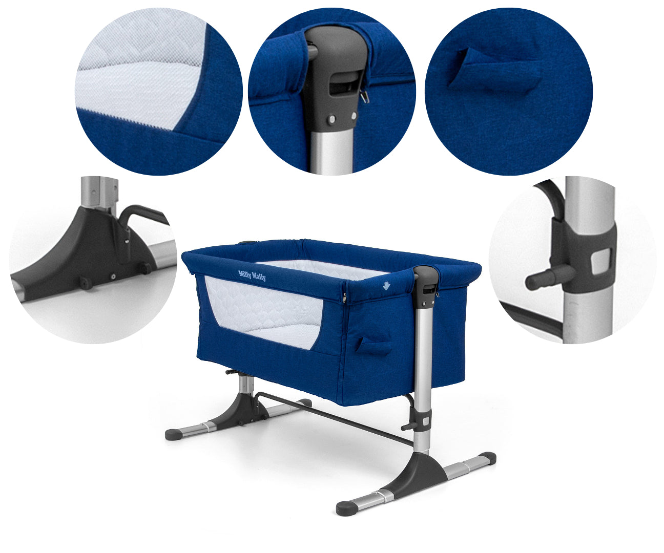 A Side by Side pótágyként és különálló ágyként is használható. A négyfokozatú állítás lehetővé teszi a hosszabbító magasságának beállítását a legtöbb ágyhoz, ami nagyon praktikus és kényelmes. A speciális rögzítési hevederek biztonságot nyújtanak kiságy funkció használatakor. A kiságy masszív lábakkal van felszerelve, amelyek minden funkció használatakor stabilitást biztosítanak. A lehajtható, hálós oldal biztosítja a megfelelő légáramlást, lehetővé teszi a baba könnyebb szoptatását, lehetővé teszi, hogy a szülők közel legyenek a baba felébredésekor, aminek köszönhetően a baba gyorsabban megnyugszik és jobban alszik.