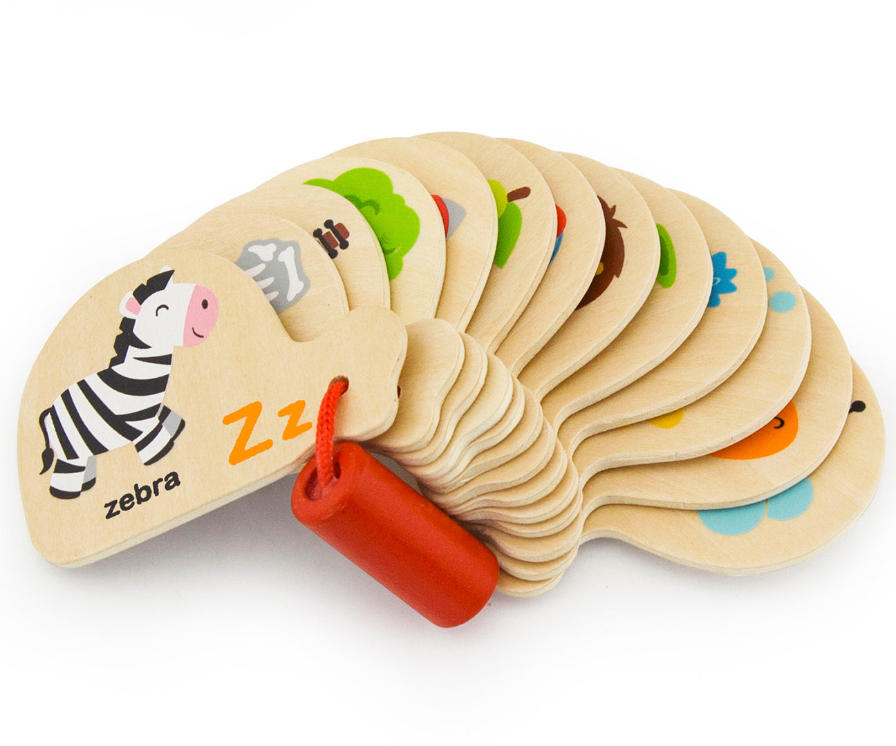 Az angol ábécé tanulását segítő könyv ideális oktatási segédeszköz gyerekeknek. Minden kártyán más kép található, amely párosítással segíti az emlékezést, majd a szó angol neve és első betűje (nagybetű és kisbetű). Minden kártyát egy piros zsinór köt össze, amelyen egy piros gyöngy is át van fűzve.