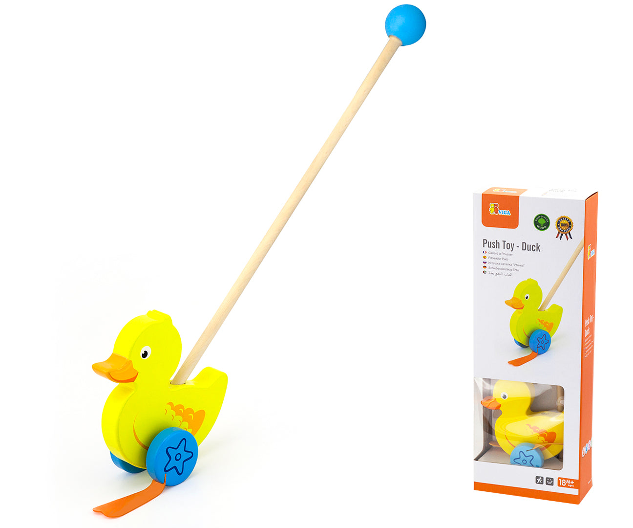 A Viga cég kacsás tolóját olyan gyerekeknek tervezték, akik most tanulják meg az első lépéseket. A színes toló mindenképpen ösztönzi a babát a járástechnika fejlesztésére. Ideális játék, amely a közös séták során is hasznos lehet. A tolóhoz gumi alkatrészek vannak rögzítve, amelyek vicces módon utánozzák a sétáló állatokat.