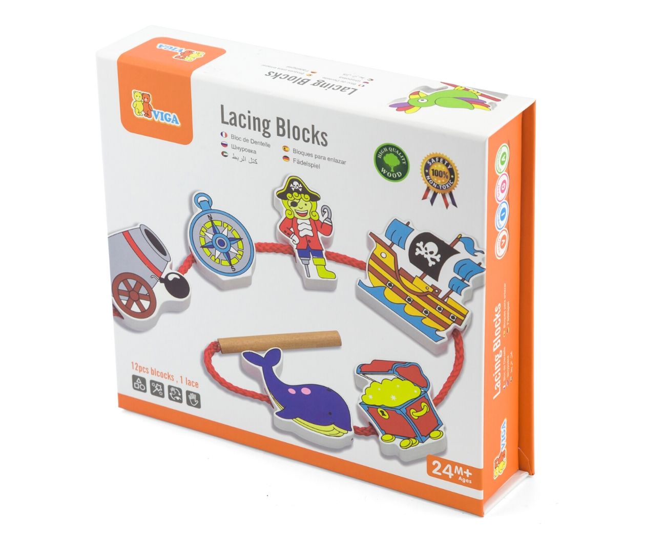 Viga "Kalózok" cérnával ellátott játékkockák újdonsága - gondosan elkészített játékkockák, mind a 12 elem mindkét oldalát kézzel festették. A kockákhoz tartozik egy zsinór és egy fa tű, amellyel a kockákat tetszőleges sorrendben felfűzheted.